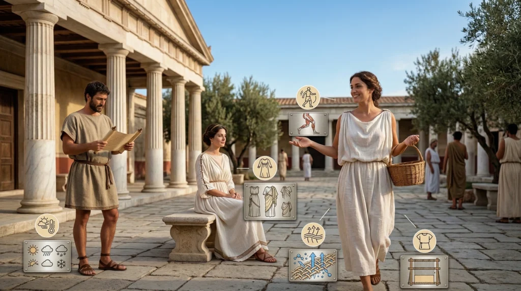 Ancient Greece experienced long, warm summers, so clothing needed to be breathable. The linen Ionic chiton allowed air to circulate easily, helping people stay cool throughout the day.